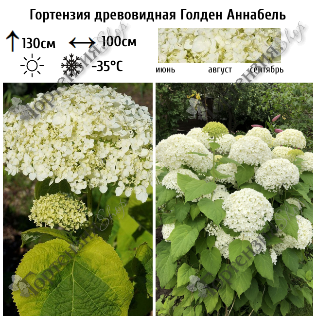 Гортензия древовидная Голден Аннабель — Эффектная древовидная гортензия с огромными белыми цветами в щитках, обильно цветет с июня по сентябрь. Растение очень разветвленное, с опушенными ветвями и соцветиями. Листья опадающие, овальные, около 10 см, зеленые с желтой каймой, на длинных черешках -невероятно декоративны весь сезон. Цветёт Золотая Аннабель очень обильно на побегах текущего года и на прошлогодних побегах с июля по сентябрь. Огромные пышные соцветия собраны из множества стерильных цветков диаметром около 2 см, в начале цветения лимонно-зеленоватых, затем молочно-белых. Куст Голден Аннабель в цвету - ослепительное зрелище! Короткая весенняя обрезка обязательна. Зимостойкость до -29 градусов, в зоне средней полосы требуется укрытие на зиму. Предпочитает солнечные участки, но может расти и в полутени. Переносит более нейтральные почвы, рН 5,5-6 чем другие гортензии. В сезон почва всегда должна быть от прохладной до влажной. Подходит для бордюрных посадок, миксбордера, одиночная и групповая посадка.