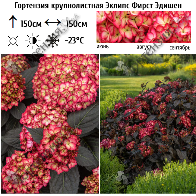 Гортензия крупнолистная 'Эклипс Фирст Эдишен' – настоящая темнолистная гортензия, высотой до 150 см. Листья сохраняют свой насыщенный темно-фиолетовый цвет в течение всего лета, даже в теплом климате. Гортензия Eclipse имеет округлую форму, которую можно сочетать с другими растениями. Сорт также отличается впечатляющими яркими малиново-красными или неоново-фиолетовыми цветками, которые цветут с конца весны до осени.