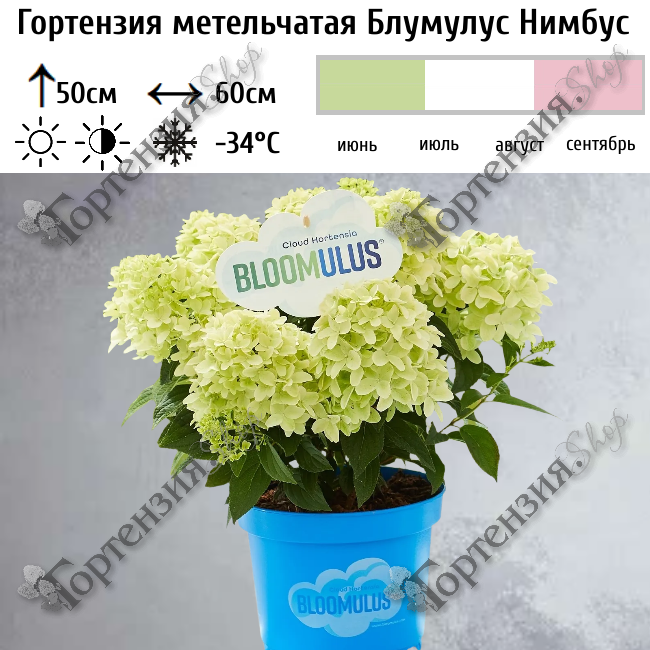 Гортензия метельчатая Блумулус Нимбус (Bloomulus Nimbus) – низкорослый сорт с очаровательными сияющими цветками словно бесчисленные маленькие звездочки. Форма соцветия шаровидная, плотная, лепестки вытянутые. Бутоны сначала зеленоватые, затем меняют окрас на белый, а на пике цветения интенсивный переход к пыльно-розовому. «Вулкан цвета»: яркий акцент за счет плотности и интенсивной окраски. Очень раннее цветение с июня, отличная стойкость на протяжении всего лета и до поздней осени. Благодаря компактному размеру, он отлично подходит для выращивания в контейнерах/кашпо, а также для бордюров в саду.