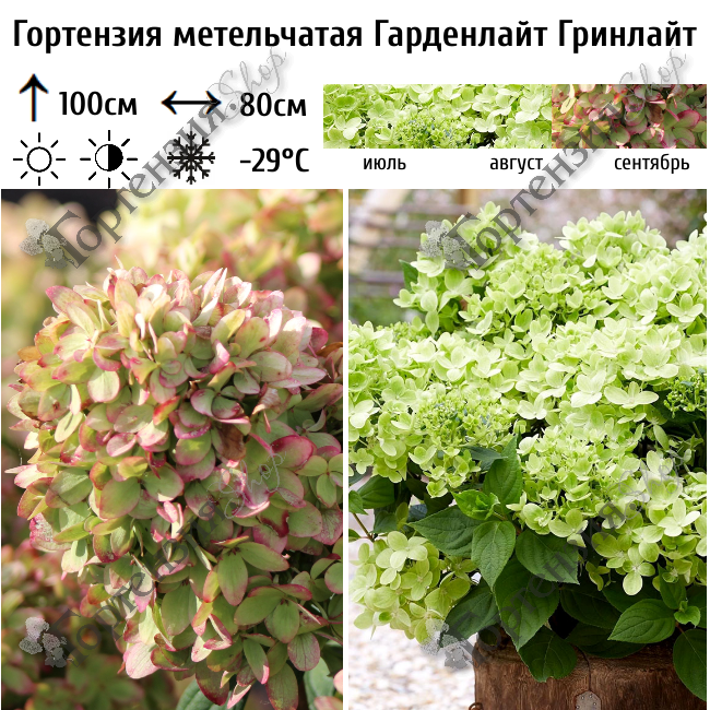 Гортензия метельчатая Гринлайт (GREENLIGHT) серия Gardenlights- пышно цветущий, очень компактный кустарник. Высота куста до 100 см, ширина до 80 см. Ветви крепкие прямостоящие. Листья зеленые , цветет с июля по сентябрь. Цветы сначала ярко лаймовые, к концу цветения на лепестках появляется розовая кайма. Почва должна быть кислая, влажная, но без застоя воды. Зимостойкость-29С. Используется для миксбордеров, небольших садов можно выращивать в контейнере.