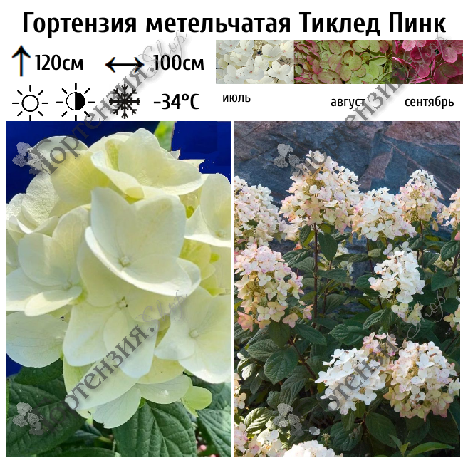 Гортензия метельчатая Тиклед Пинк -  раскидистый, сильный  куст высотой до 120 см, Очень большие соцветия распускаются в июле. Осенью белые цветы приобретают приятную розовую окраску. Цветёт с  июля и до сентября. Стерильные цветки крупные, вывернутые наружу, на длинных цветоножках - верхние смотрят вверх, нижние - изящно свисают вниз, что придаёт соцветию кружевной вид.