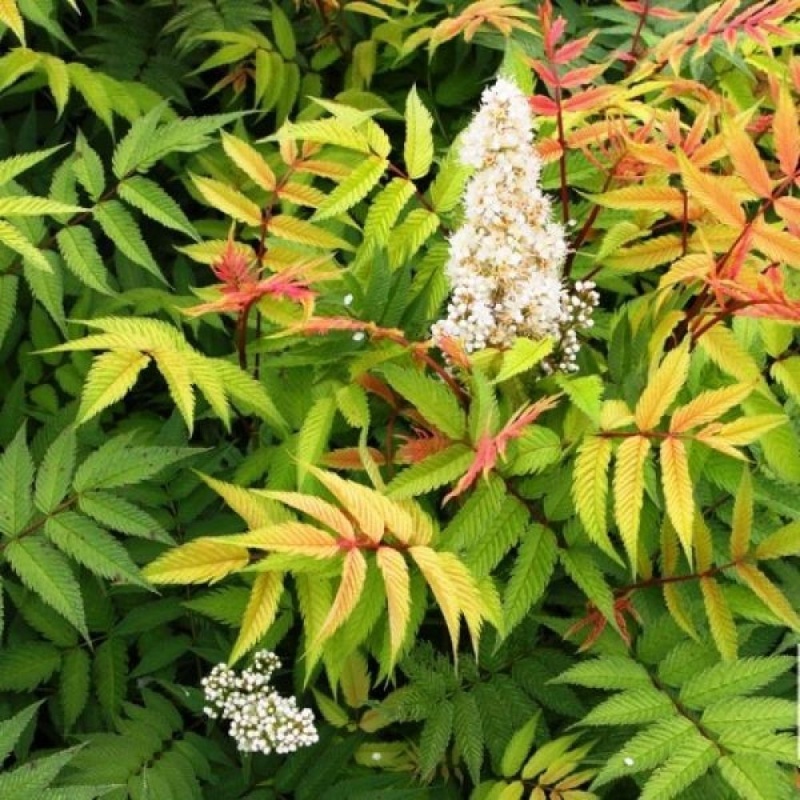 Рябинник рябинолистный (Sorbaria sorbifolia) Сэм - компактный густой кустарник высотой до 3 м. Листья декоративные,при распускании розовых, летом светло-зелёных, осенью желтеющих или принимающих красную окраску. Цветки кремово-белые, в некрупных соцветиях, цветёт необильно в июне-июле. Светолюбив, переносит лёгкое затенение, но в тени теряет окраску листьев и компактность кроны. Неприхотлив к почвенным условиям, но требователен к влажности почвы. Не переносит засуху. Зимостойкость высокая. Очень перспективный и яркий кустарник. Может быть использован в качестве живой изгороди и в групповой посадке.