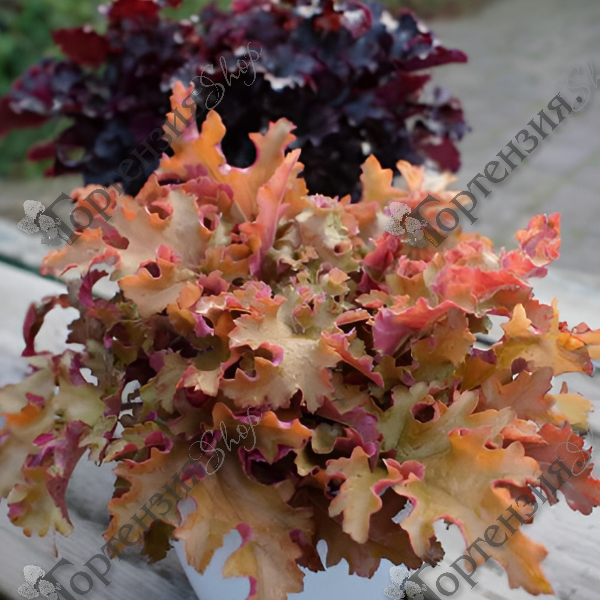 Гейхера Зиппер (Heuchera Zipper) - многолетнее травянистое растение высотой до 35 см, листья большие гофрированные, нижняя часть красная, верхняя часть оранжевая. Цветки белые в кистевидных соцветиях.  Цветёт в июне-июле. Морозостойкость до -34С. Подходит для украшения каменистых горок, миксбордеров. Эффектно смотрится как в одиночных, так и в групповых посадках.