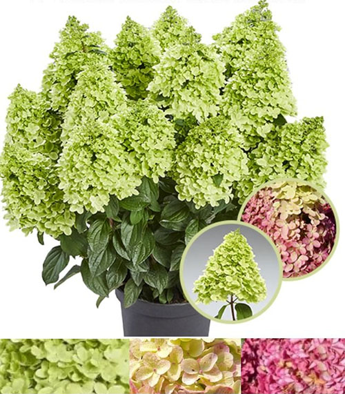 Метельчатая гортензия "Пандалус" – эксклюзивная серия Патио немецкой селекции PAN, отличается невысокой, компактной и пышной формой куста, высотой до 100 см, и диаметром до 80 см, рано зацветает и обильно цветет, неприхотлив в уходе. Цветки имеют выраженный приятный аромат, которым будет окутан ваш сад на протяжении всего периода цветения. Соцветия плотные, конусовидные, в начале цветения нежно-зелёного цвета, затем постепенно к осени становятся ярко-розовыми. На солнечном участке или в легкой полутени цветение будет пышнее и ярче. Ветви крепкие, прямостоячие. Цветет с июня и до заморозков. Зимостоек, неприхотлив. Прекрасно смотрится как бордюрное растение, так и очень декоративны в кашпо.